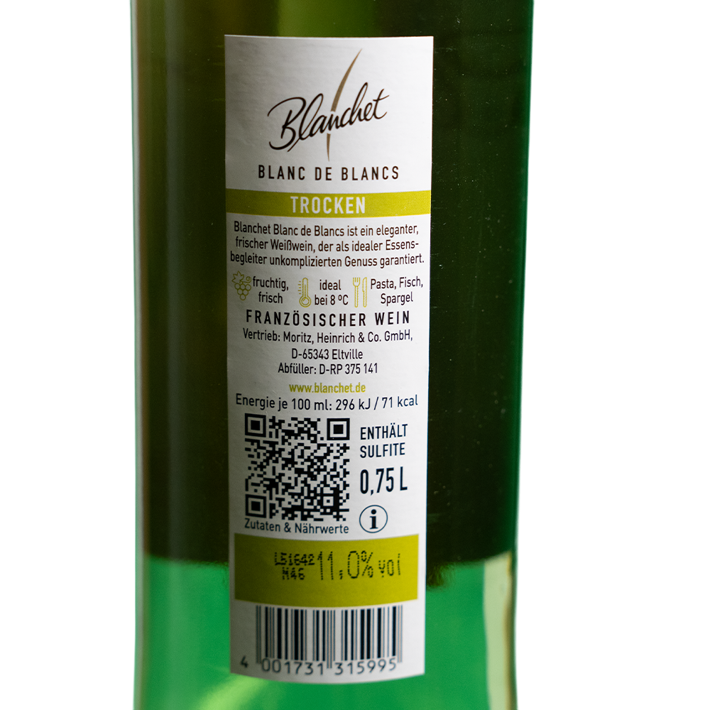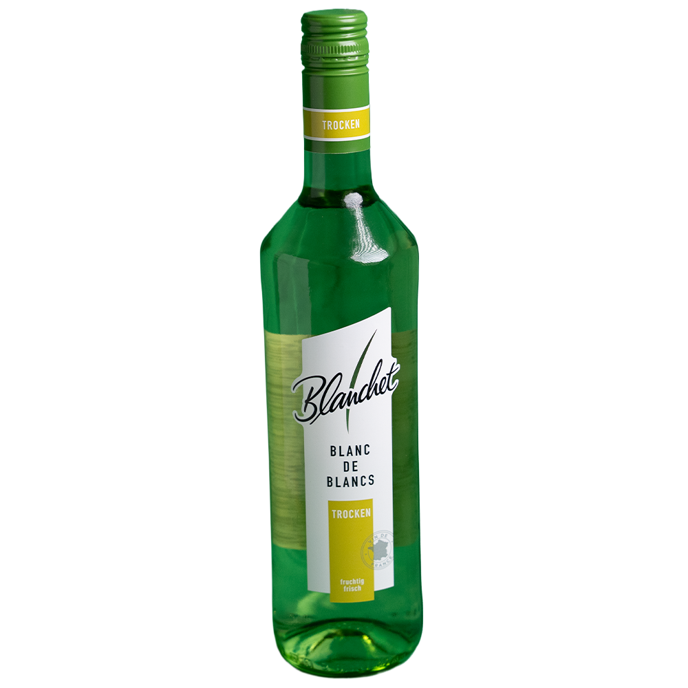 Der Blanchet Blanc de Blancs Trocken ist ein eleganter Weißwein mit harmonischer Frische und ausgewogener Frucht. Hergestellt aus sorgfältig ausgewählten hellen Trauben, entfaltet er ein feines Bouquet aus Zitrusfrüchten, grünem Apfel und einer dezenten floralen Note.